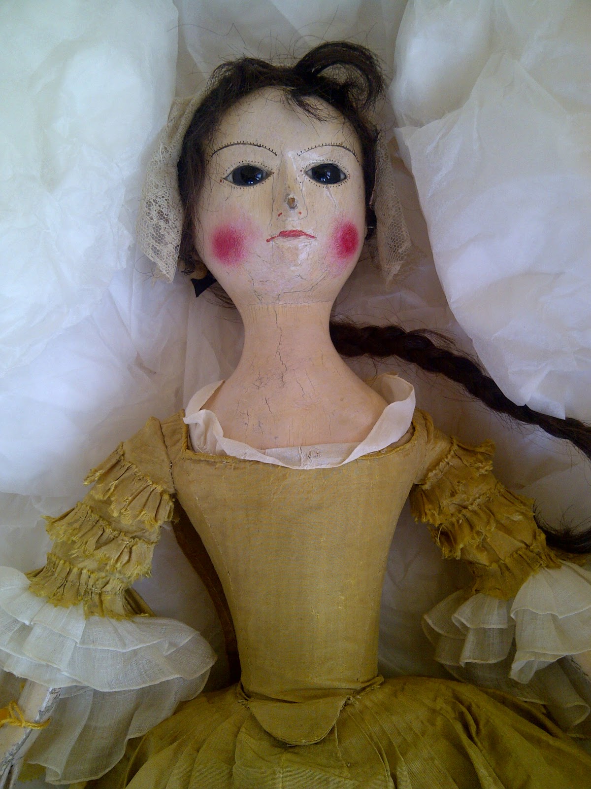 Here are some photos including, whats under the skirt--which all us dollmakers need to know. Interestingly enough she had no panties, but does have a most fabulous, boned corset, of which you can see the base of. She is a very large doll, and her dress is made of a stunning, rich yellow dupion silk. I will feature more close up photos etc, in a booklet on my workshop--so watch this space. Details up in the next few days and places are limited....enjoy !